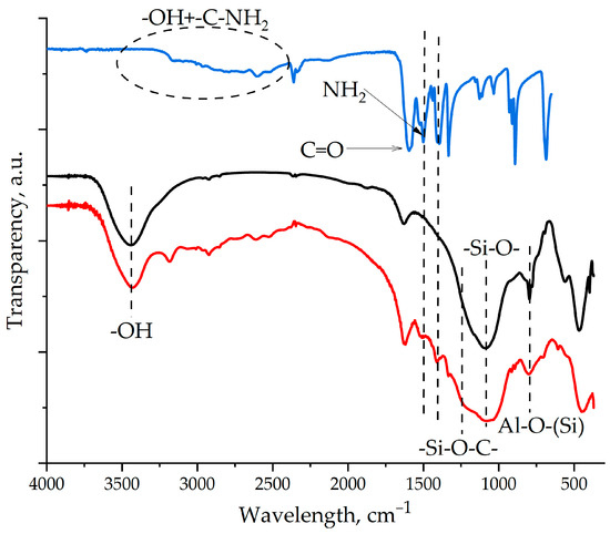 The chemical interaction of the amino groups in aminoacetic acid with the epoxy groups in the ED-20 oligomer was proven in our previous studies and presented in [44]. After treating the surfaces of the ASMs with aminoacetic acid, characteristic vibration peaks corresponding to the functional groups of aminoacetic acid are observed in the IR spectra of the modified samples, as shown in Figure 6, which confirms the presence of molecules of aminoacetic acid on the surface of the ASMs. In addition, broadening of the peak in the region of 1100–1000 cm−1 is noted, which is associated with the formation of the chemical bond -Si-O-C-. It is important to note that these peaks are preserved after washing the samples with water, which indicates the non-hydrolyzable nature of the -Si-O-C- bond and its resistance to water. This confirms the strength and stability of the modification. The formation of a stable chemical bond between aminoacetic acid and the ASMs shows the strong fixation of the molecules of aminoacetic acid onto the surfaces of the microspheres. Thus, the results of IR spectroscopy confirm successful chemical modification of the ASMs’ surface, which opens up prospects for their use as a functional filler in epoxy composites.