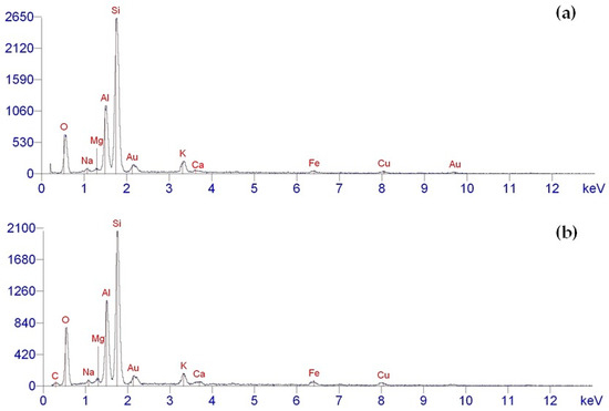 The elemental composition of both the pristine and aminoacetic-acid-functionalized ASM particles was analyzed using the EDX method. The results indicate that the chemical composition of the pristine ASM particles aligns perfectly with the data acquired through inductively coupled plasma atomic emission spectroscopy, as illustrated in Figure 8a. The EDX analysis of the unmodified ASMs revealed the presence of Si, Al, Fe, Mg, Ca, and K, which matches the expected chemical composition of the ASMs. Moreover, oxygen was also identified, indicating that these elements exist in oxide form and also correspond to the existence of hydroxyl groups on the particles’ surfaces, as shown in Figure 8a.