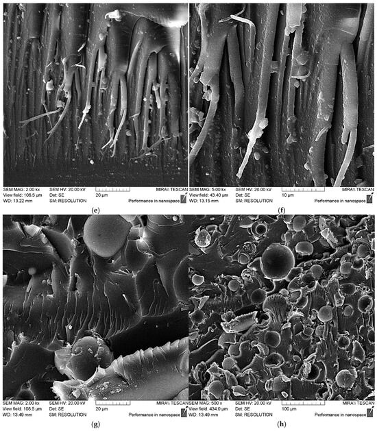 SEM data for epoxy composite samples, parts by mass: (a) 100 ED-20 + 40 TCEP + 15 PEPA; (b) 100 ED-20 + 40 TCEP + 0.1 ASM + 15 PEPA; (c,d) 100 ED-20 + 40 TCEP + 50 ASM + 15 PEPA; (e,f) 100 ED-20 + 40 TCEP + 0.1 ASM(aminoacetic acid) + 15 PEPA; (g,h) 100 ED-20 + 40 TCEP + 50 ASM(aminoacetic acid) + 15 PEPA.