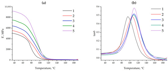 The dependence of the dynamic modulus of elasticity E′ (a) and the mechanical loss factor tanδ (b) on temperature for epoxy composites: 1—100 ED-20 + 40 TCEP + 15PEPA; 2—100 ED-20 + 40 TCEP + 0.1 ASM + 15 PEPA; 3—100 ED-20 + 40 TCEP + 0.1 ASM(aminoacetic acid) + 15PEPA; 4—100 ED-20 + 40 TCEP +50 ASM + 15 PEPA; 5—100 ED-20 + 40 TCEP + 50 ASM(aminoacetic acid) + 15 PEPA.