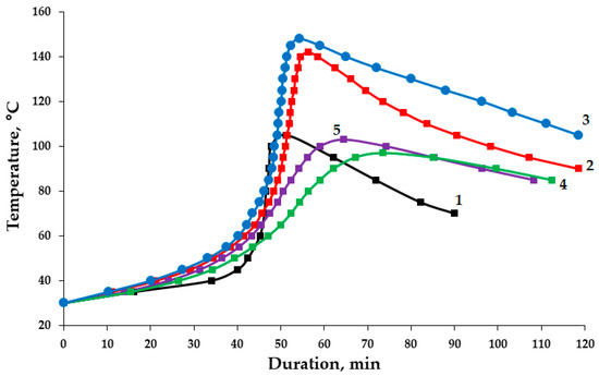 Kinetic curves for curing of the epoxy compositions: 1—100 ED-20 + 40 TCEP + 15 PEPA; 2—100 ED-20 + 40 TCEP + 0.1 ASM + 15 PEPA; 3—100 ED-20 + 40 TCEP + 0.1 ASM(aminoacetic acid) + 15 PEPA; 4—100 ED-20 + 40 TCEP + 50 ASM + 15 PEPA; 5—100 ED-20 + 40 TCEP + 50 ASM(aminoacetic acid) + 15 PEPA.