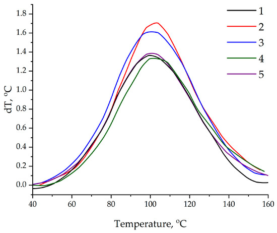 DSC data on curing of epoxy compositions: 1—100 ED-20 + 40 TCEP + 15 PEPA; 2—100 ED-20 + 40 TCEP + 0.1 ASM + 15 PEPA; 3—100 ED-20 + 40 TCEP + 0.1 ASM(aminoacetic acid) + 15 PEPA; 4—100 ED-20 + 40 TCEP +50 ASM + 15 PEPA; 5—100 ED-20 + 40 TCEP + 50 ASM(aminoacetic acid) + 15 PEPA.