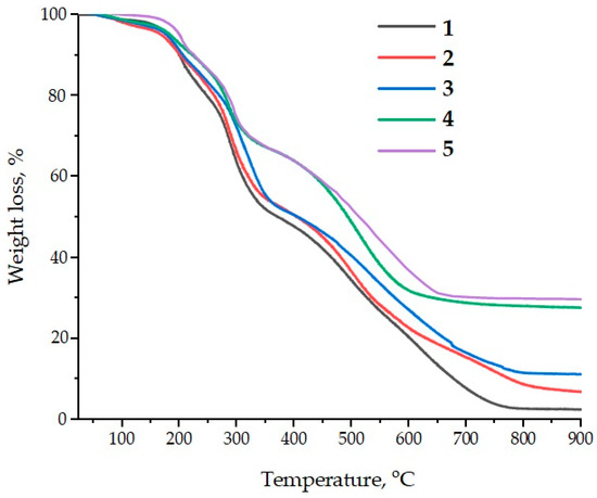 Data from the thermogravimetric analysis of the samples: 1—100 ED-20 + 40 TCEP + 15 PEPA; 2—100 ED-20 + 40 TCEP + 0.1 ASM + 15 PEPA; 3—100 ED-20 + 40 TCEP + 0.1 ASM(aminoacetic acid) + 15 PEPA; 4—100 ED-20 + 40 TCEP + 50 ASM + 15 PEPA; 5—100 ED-20 + 40 TCEP + 50 ASM(aminoacetic acid) + 15 PEPA.