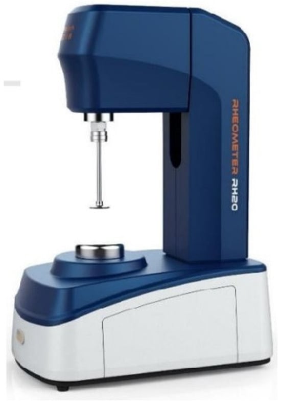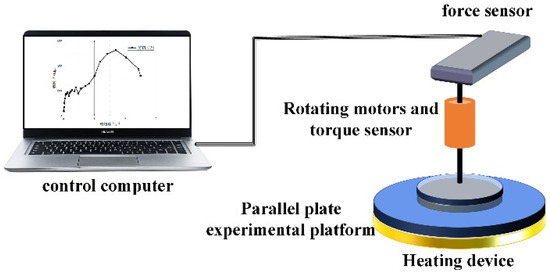 In actual production, the propellant slurry will be kept at a consistent temperature of 50 °C throughout the mixing, transportation, and pouring processes. The test used a rotary rheometer (Baosheng H20, Shanghai, China) to control the test temperature, and the operational software (BosinTechRH V1.1.0.1) allowed for the configuration of operating processes. Figure 3 shows a schematic diagram of the H20 rotary rheometer, whereas Figure 4 shows the actual picture.
