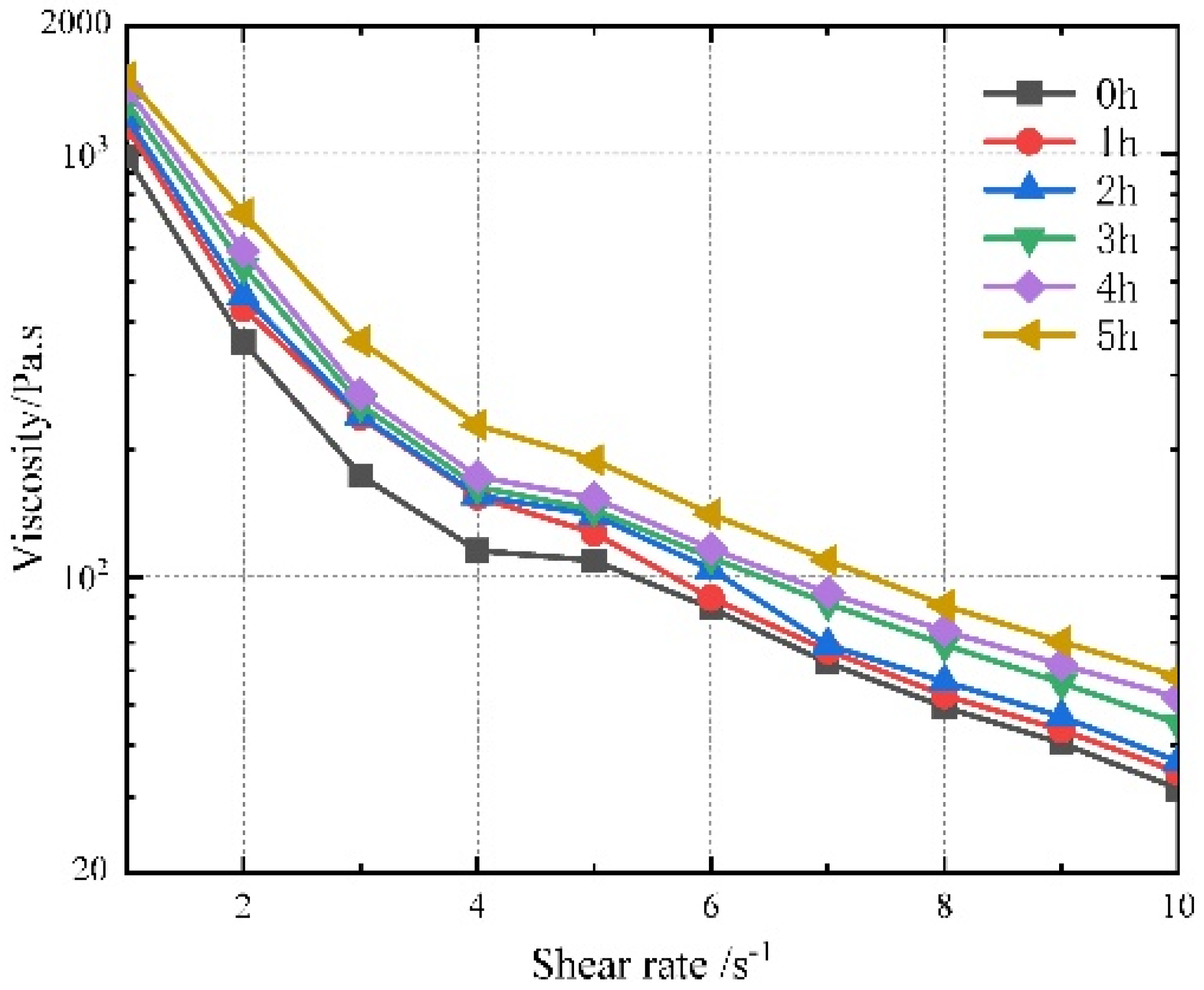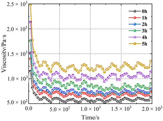 Vertical analysis reveals that, after the same acting time of shearing, the apparent viscosity of the slurry increases with the length of the curing cycle. The viscosity difference grows larger as shear time increases. At the start of a shear test (when shear time is zero), the curing time ranges from 0.5 to 5 h, resulting in a viscosity difference of approximately 1000 Pa·s. After 180 s of shearing, the pressure difference exceeds 2000 Pa·s. Further calculation reveals that, under the same shear rate, the viscosity of the slurry generally decreases by about 50% during the solidification period of 0 to 5 h, with the slurry cured for 3 h showing the most significant decrease of 52.53%.