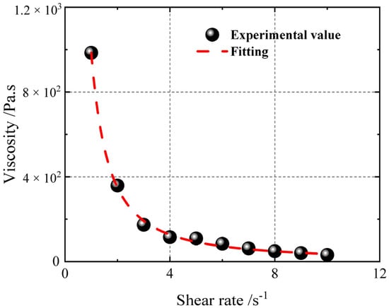 The variation in initial viscosity (t = 0) with shear rate is analysed and fitted using the Levenberg–Marquardt algorithm (hereinafter referred to as the LM algorithm) on the basis of the HBP constitutive model, yielding the viscosity constitutive model shown in Figure 8 below. The test results show that as the shear rate increases, the viscosity gradually decreases. When the shear rate is low, the viscosity changes dramatically.