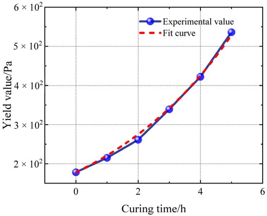 To establish the mathematical relationship between increasing yield stress and curing time, the data shown in Table 3 and Table 4 are fitted by curves. The fitting takes curing time as an independent variable and the yield stress of the slurry as a dependent variable. The non-linear fitting used the LM algorithm with the logarithm function as the target function. The red short dash line represents the curve after curing, as expressed by Equation (10).
