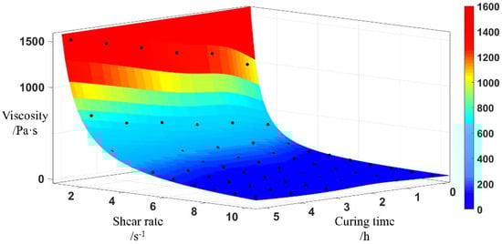 To obtain the above-mentioned HBPW model, the viscosity–shear rate constitutive model is fitted for each curing time. The viscosity of the slurry with six curing times ranging from 0 to 5 h is fitted, and the constitutive parameters for each curing time are determined, as shown in Table 4.