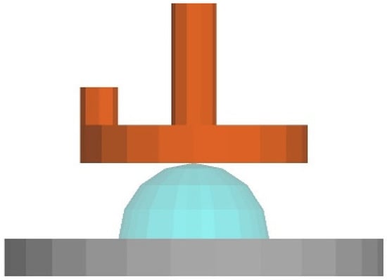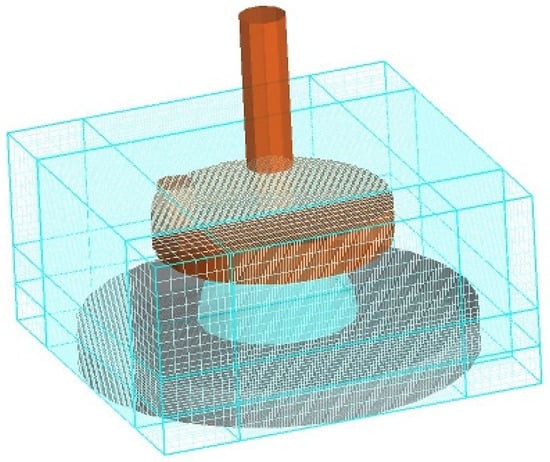 A finite element simulation model was established using the dimensions of the clamp used in the test. During the test, a parallel plate clamp with a diameter of 20 mm was utilised to conduct the rheological test. As the rotor spins, the gap between the parallel plates measures 2 mm. The upper plate had a diameter of 20 mm, while the lower plate had a diameter of 30 mm. The distance between the upper and lower parallel plates started at 15 mm and decreased to 2 mm, as shown in Figure 11. The movement of parallel plates is divided into two stages of equal size. The upper plate drops from 15 mm to 2 mm in the first stage and then moves at a shear rate of 1 s−1 in the second stage. Since the rheometer used in the experiment measures the shear rate of the fluid at the 2/3 radius of the parallel plate, we set the rotational speed of the upper plate in the second stage to 2.3 rad/s.