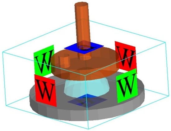 To accurately simulate the real environment during the test, the pressure above the surface must be set to the standard atmospheric pressure (P). Other parts are set as the wall surface: W. The boundary conditions are set as illustrated in Figure 13.