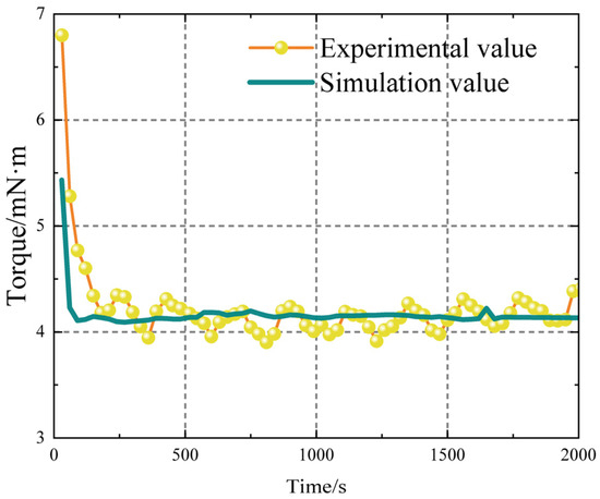 Observing Figure 14, it is apparent that at the initial time, the experimental torque is higher than the simulated torque. This discrepancy arises because the initial slurry contains some particles in an agglomerated state. When the rheometer shears these agglomerated particles, it exerts a higher torque due to the disruptive effects on the agglomerates. In contrast, the simulation does not account for these particles, resulting in a lower simulated torque at the initial moment. Thus, the experimental torque is higher than the simulated torque at the beginning.