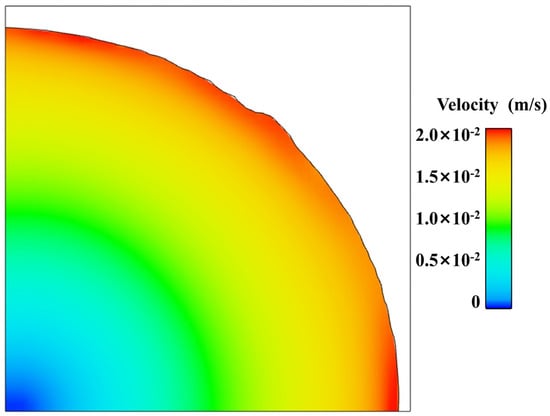 Figure 15 displays a velocity cloud map of the 1.1 mm section, with arrows indicating the flow direction of the propellant slurry. It is evident from observing the flow process that the fluid moves in the same direction as the top parallel plate. Additionally, the slurry velocity at the edges is higher, reaching 0.02 m/s, while the velocity at the centre is nearly 0.