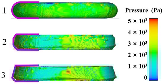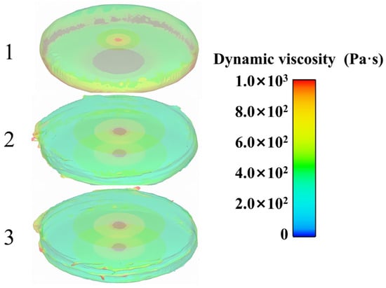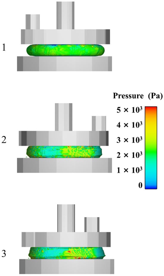 Figure 16 displays the different rotational stages of the upper parallel plate, illustrating the progression from early to middle to late stages, arranged from top to bottom. Here, No. 1 represents the early stage, No. 2 the middle stage, and No. 3 the late stage, corresponding to the initial, developmental-extreme, and stable stages of the flow field variation, respectively. Figure 17 provides a detailed view, illustrating the progression from start to finish. As the upper parallel plate falls, the propellant slurry gets compressed. The cloud map observation in the early stage reveals a gradual approach to the slurry’s edge, forming a smooth arc. Concurrently, the pressure field remains consistent, and there are no abrupt pressure fluctuations, suggesting that there is no occurrence of wide-scale flow in the slurry. Based on the cloud map in the middle state, it is evident that the rotation of the parallel plate causes internal flow and leads to non-uniform pressure. The slurry flows inside under the action of parallel plates. The uppermost and lowermost slurries adhere to the plate’s surface, with the middle portion gradually bulging out due to centrifugation. Concurrently, the slurry’s edges are clearly visible, while the height in the middle stands out. Based on the cloud map of the slurry in the late stage, it is evident that the pressure distribution becomes less uniform and there is an increase in high-pressure areas. In addition, the positions with protruding edges shift and gradually move closer to the lower parallel plate. This occurs because the propellant slurry naturally moves downward due to gravity, causing its shape to gradually resembles a cone with a protruding corner at the edges.
