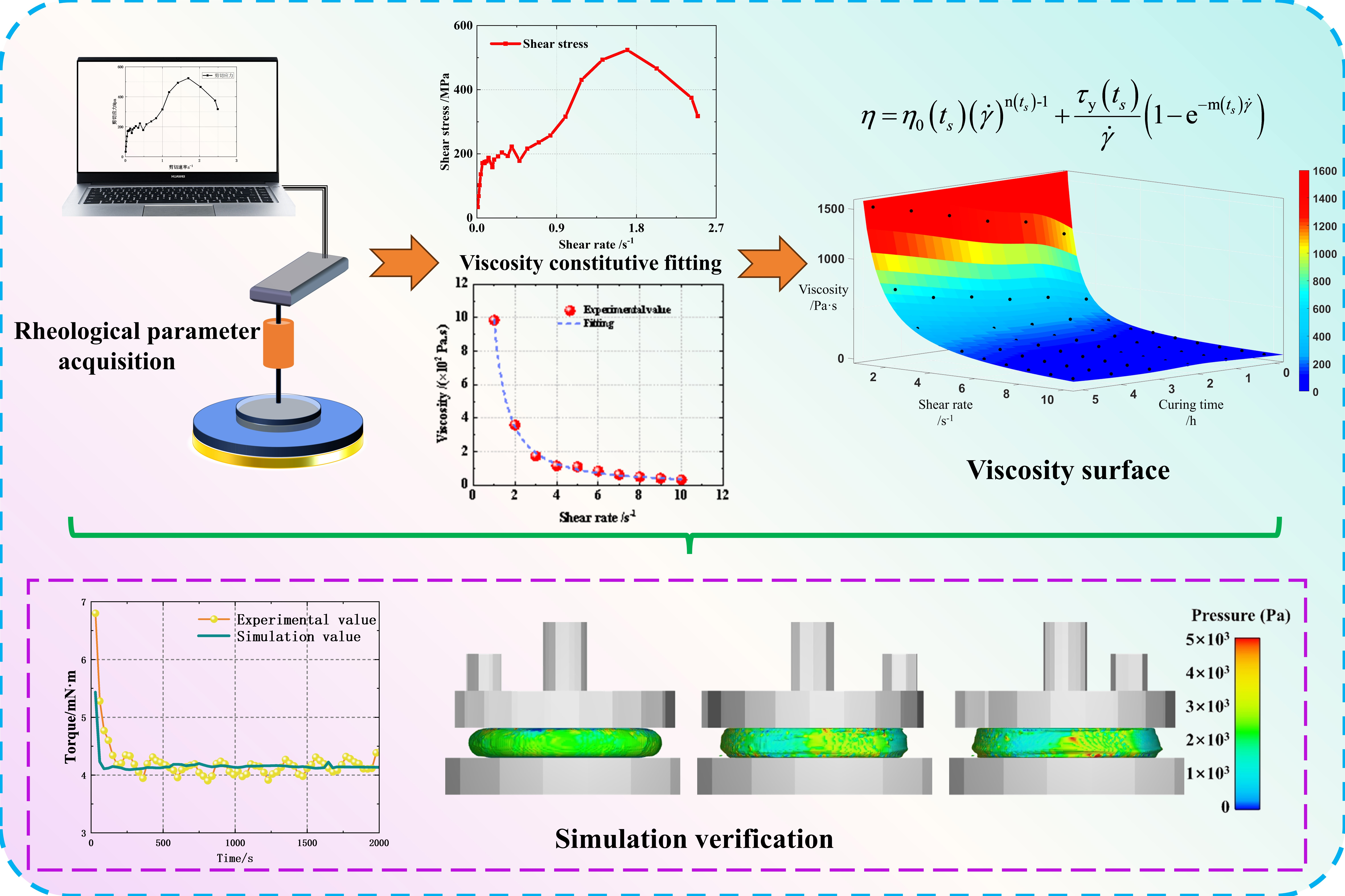 This research consists of three main parts: investigating the constitutive model for viscosity, conducting tests on rheological properties, and verifying the findings through simulation.