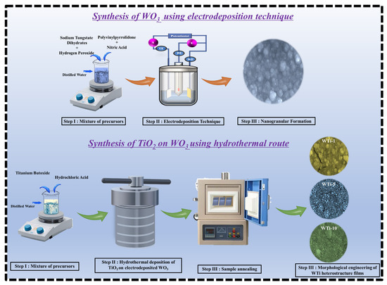 TiO2 films were grown on the pre-deposited WO3 layers via a conventional hydrothermal method. The precursor solution was prepared by mixing 50 mL of DI water with 50 mL of concentrated HCl under continuous stirring. After complete mixing, 1 mL of C16H36O4Ti was added dropwise, and the resulting solution was stirred for an additional 30 min at room temperature to ensure homogeneity. The pH of the resulting acidic precursor solution was approximately 1.0. The WO3-coated FTO substrates were placed vertically in a Teflon-lined stainless-steel autoclave containing the precursor solution. The autoclave was then sealed and maintained at 150 °C for different reaction times of 1, 5, and 10 h to examine the effect of the duration of TiO2 growth on the properties of the heterostructure films. After the hydrothermal process, the autoclave was allowed to cool naturally to room temperature. The resulting TiO2-coated WO3 films were carefully removed, rinsed thoroughly with DI water to eliminate any unreacted precursor residues, and dried under ambient conditions. To improve the film’s quality and enhance their crystallinity, the samples were annealed in air at 500 °C for 30 min. The obtained WTi heterostructure films were labeled as WTi-1, WTi-5, and WTi-10, corresponding to TiO2 growth times of 1, 5, and 10 h, respectively. These samples were used for all subsequent characterizations. Figure 1 illustrates the schematic representation of the fabrication process for the WTi heterostructure.