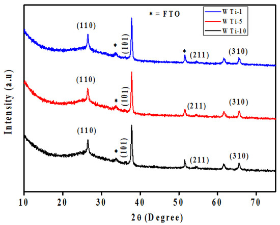 To investigate the structural characteristics of the synthesized films, XRD was performed on the WTi heterostructures fabricated by first depositing a WO3 layer onto FTO substrates via electrodeposition, followed by the hydrothermal growth of TiO2 for varying durations. The resulting samples, labeled as WTi-1, WTi-5, and WTi-10, correspond to TiO2 growth times of 1, 5, and 10 h, respectively. All diffraction profiles, as shown in Figure 2, display a broad and intense hump in the 2θ range of 20–27°, which is characteristic of the amorphous structure of the underlying WO3 layer. This broad feature indicates the absence of a long-range crystalline order and is typical for electrochemically deposited WO3 [19]. The amorphous nature of this layer is advantageous for EC applications, as it provides enhanced ion diffusion channels, structural flexibility, and abundant active sites for redox reactions. Overlaid on the amorphous background are distinct and sharp peaks at 27.4°, 36.1°, 54.3°, and 69.0°, which correspond to the (110), (101), (211), and (310) planes of rutile TiO2. These reflections match well with the tetragonal rutile phase as indexed by JCPDS card no. 01-088-1175, confirming the successful formation of crystalline TiO2 on top of the WO3 layer. The increasing intensity of these TiO2 peaks from WTi-1 to WTi-10 reflects a clear enhancement in crystallinity with longer hydrothermal growth durations. Additional minor peaks, marked with an asterisk (*), originate from the underlying FTO substrate. No extraneous or unidentified peaks are detected, confirming the phase purity of the heterostructures. This combination of a structurally disordered WO3 base and a well-crystallized TiO2 overlayer forms a highly functional interface, where the amorphous layer supports rapid ion transport while the crystalline layer enhances stability. Such a heterostructured configuration is particularly suited for advanced ECDs, enabling efficient optical modulation and long-term cycling performance [20].