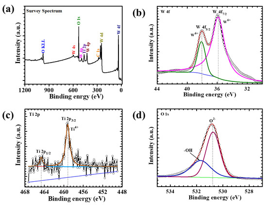 (a) XPS survey spectrum, high-resolution (b) W 4f spectrum, (c) Ti 2p spectrum, and (d) O 1 s spectrum of the WTi-5 sample.