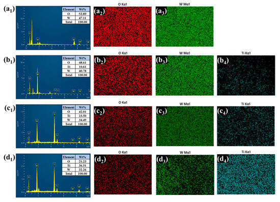 (a1–d4) EDS and elemental presentation of bare and all the WTi heterostructure thin films.