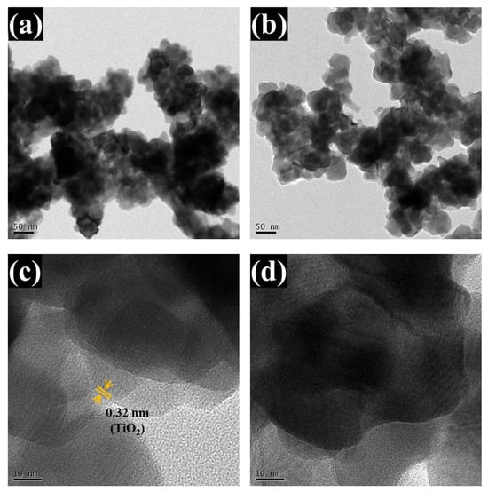 The analyzed TEM images (Figure 6a–d) further validate the bilayer heterostructure. Low-magnification TEM images (Figure 6a,b) show spherical nanoparticles forming a continuous network. This observation aligns closely with the FESEM results, which revealed a homogeneous and well-organized nanoparticle structure with distinct spherical features. High-resolution TEM (Figure 6c,d) shows a sharp interface between two layers: the lower amorphous WO3 (appearing as a disordered region) and the upper crystalline TiO2, which displays distinct lattice fringes. The measured interplanar spacing of ~0.325 nm corresponds to the (110) planes of tetragonal rutile TiO2, consistent with the standard JCPDS card no. 01-088-1175. The amorphous nature of WO3 is confirmed by the absence of lattice ordering and corroborated by earlier XRD analyses. These results unequivocally confirm the successful formation of a coherent, structurally integrated WO3/TiO2 heterojunction and strongly support the interface-engineered design strategy.