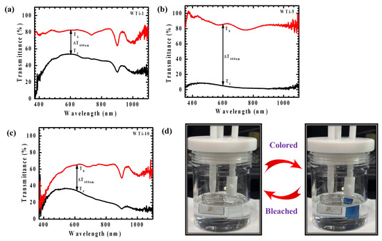 (a–c) Transmittance spectra of WTi-1,WTi-5, and WTi-10 heterostructure thin films; (d) photographs of bleached and colored states of WTi-5 thin film.