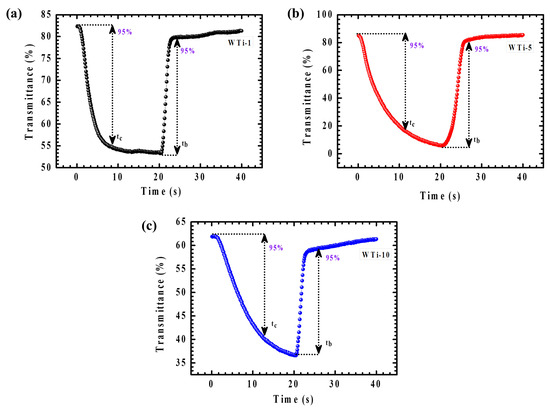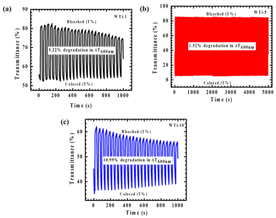 (a–c) In situ transmittance cycling stability for WTi-1,WTi-5, and WTi-10 heterostructure thin films.