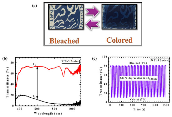 (a) Photograph of the WTi-5 heterostructure thin film device in the bleached and colored state. (b) In situ transmittance and (c) long-term stability of WTi-5 device.