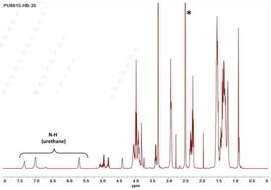 1H-NMR spectrum of poly(ester-urethane) PU8015-HB-35 in deuterated dimethylsulfoxide (DMSO-d6). The residual peak of the deuterated solvent is indicated by an asterisk (*).