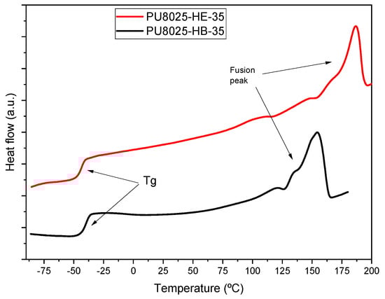 Regarding the melting enthalpies (ΔHf), a progressive increase was observed as the hard segment (HS) content in the formulations increased. This behaviour was expected, as a higher proportion of hard segment promotes the formation of more extensive and defined crystalline domains, which directly contributes to the increase in melting enthalpy. Furthermore, the enhanced crystallinity of the hard segment promotes more pronounced microphase separation between soft and hard domains, thereby contributing to the development of a well-defined phase morphology [].