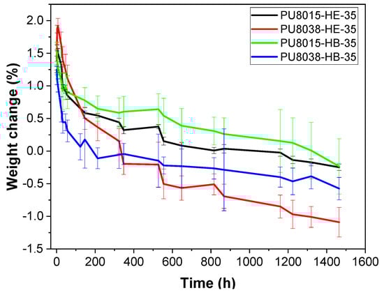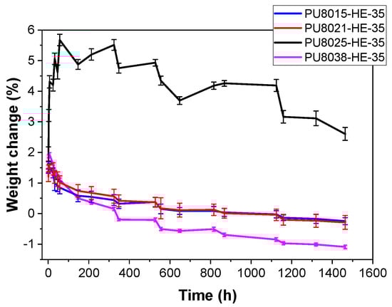 The changes in sample mass over a period of 0 to 1500 h in water are presented in Figure 3. These variations reflect the water uptake capacity of the materials and serve as an indirect indicator of their hydrophilicity. For all studied polymers, weight change curves presented two clearly differentiated states. At the beginning of the immersion, a maximum water absorption was reached, followed by a very slow decay of weight over time. The shape of the weight loss curves in the swollen state is characteristic of surface erosion, with indicating very low total degradation. As shown in Figure 3, when comparing polyurethanes synthesised from CAPA®-8021 and CAPA®-8025—which possess comparable molecular weights but differ in lactic acid content—it is evident that degradation proceeds more rapidly in the material based on the polyol with a higher lactic acid content. Specifically, the polyurethane derived from CAPA®-8025 (PU8025-HE-35), which has a lower lactic acid proportion, exhibits a significant initial swelling, with its mass increasing by approximately 6% within the first 100 h. Subsequently, its weight decreases progressively, following a trend similar to that observed for the other polyurethanes. The higher initial swelling for PU8025-HE-35 (circa 6% weight) could be explained by a higher amount of amorphous phase, which allows for a higher penetration of water in the material. This behaviour has also been found in a series of polyurethanes with PCL of different lengths as soft segment, where the completely amorphous PU swelled by 80% in weight despite the hydrophobicity of the PCL soft segments []. This higher amount of amorphous phase is difficult to demonstrate from DSC data, although this PU combines the lowest Tg (softer amorphous phase) and the second lowest hard segment crystallinity. Nevertheless, all PUs, including PU8025-HE-35, showed a high hydrophobicity with low values of water swelling (below 2% weight PU8025-HE-35 excluded).