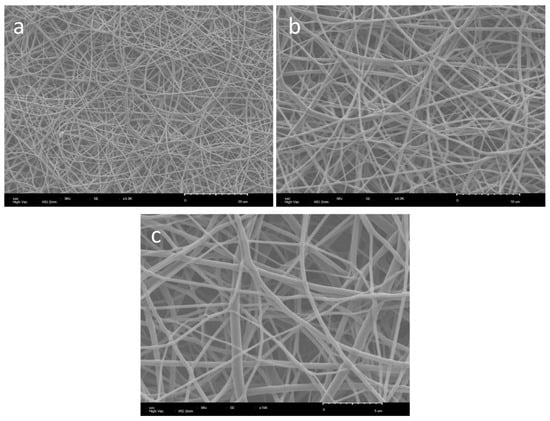 The scanning electron micrographs (SEM) presented in Figure 5 reveal a matrix of electrospun fibres of polyurethane (PU8038-HB-50), with diameters ranging from 350 to 990 nm. These values were obtained from a polymer solution at 10 wt%, a concentration that falls within the intermediate range reported in the literature for producing high-quality fibres []. The diameters achieved are consistent with the viscosity of the solution, which was made possible by the high molecular weight of the polyurethane used (255 kDa). This elevated molecular weight promotes a greater degree of chain entanglement, thereby increasing the solution viscosity and ensuring the stability of the jet during the electrospinning process [,,]. It is important to note that the viscosity must reach a critical balance. If too low, the solution lacks the necessary entanglement density, leading to the formation of beads or electrosprayed droplets; if sufficient, but the chain overlap remains below the critical threshold, bead-on-string morphologies may still occur [,]. As described in previous studies [,,], increasing the viscosity not only reduces the extent of jet stretching under the electric field, resulting in thicker fibres, but also alters the morphology of the beads—from spherical droplets at low viscosities to elongated ellipsoids and eventually to smooth, bead-free fibres as viscosity increases. Zong et al. further observed that bead spacing increases with viscosity, highlighting the complex interplay between viscoelastic properties and fibre morphology []. The morphological results in the present work suggest that this critical viscous balance was achieved, leading to the formation of homogeneous and structurally consistent fibres under the processing conditions employed. Polyurethane scaffolds exhibited a tensile strength of approximately 4.4 ± 0.3 MPa.