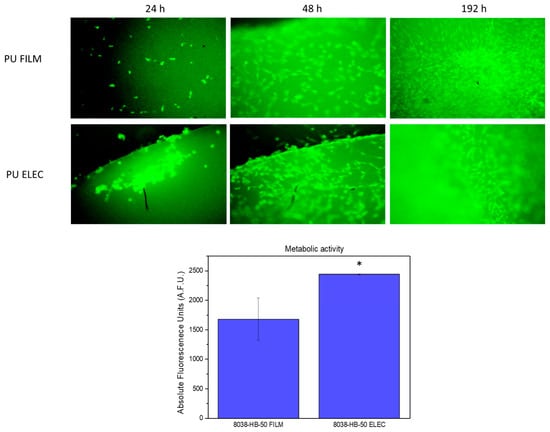 Up images of endothelial C166-GFP cell cultures after 24 h, 48 h, and 192 h on PU8038-HB-50 at 15× Down. Metabolic activity of cell culture at 192 h over samples (Alamar Blue). Significant differences stand for * (p ≤ 0.05).