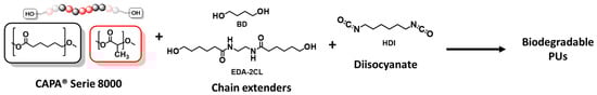 In this study, four PCL-based polyols from the CAPA® 8000 series (CAPA 8015, 8021, 8025, and 8038) were used as soft segments for the preparation of biodegradable linear polyurethanes. Hexamethylene diisocyanate (HDI) served as the diisocyanate component, while two types of chain extenders—BD and EDA-2CL—were incorporated to evaluate the influence of hydrolytically stable and degradable extenders, respectively. The NCO:OH molar ratio was maintained at a strict stoichiometric balance in all formulations to promote the formation of high-molecular-weight linear polymers (Scheme 2).