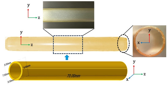 First, an SPU solution was prepared by adding 1.5 g of polymer to 10 mL of THF. A glass rod with a diameter of 7 mm was used as a mold and placed horizontally inside a glass tube containing the polymeric solution. The soaked mold was rotated at low speed (40–60 rpm) for approximately 30 s until the solvent evaporated. This procedure was repeated and the thickness measured with a Mitutoyo micrometer, until a wall thickness of 0.5 mm was reached. Finally, the SPU conduit was removed from the glass mold. The dimensions of SPU conduits were set at 70 mm length with an outer diameter of 8 mm, an inner diameter of 7 mm, and a wall thickness of 0.50 mm (see Figure 1). These dimensions are similar to the collagen nerve conduits manufactured by NeuraGen [23]. The outer diameter of the manufactured conduit is within the range reported for peripheral nerves (1–20 mm) [24].