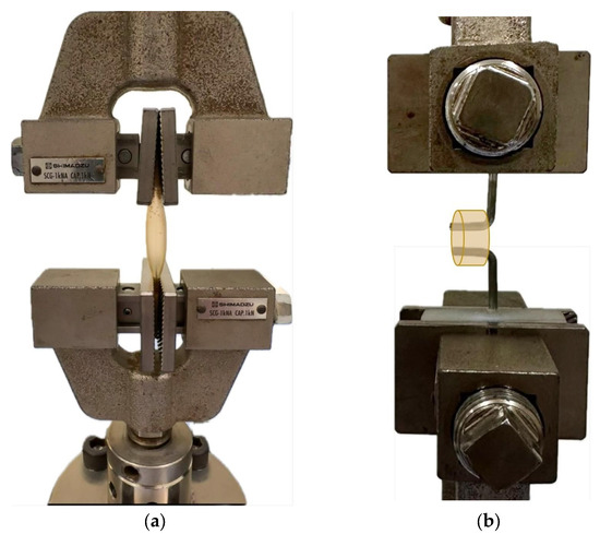 Currently, there is no ISO standard for obtaining the mechanical properties of nerve guide conduits; however, in this work, longitudinal and radial tension tests were performed according to ISO 7198:1998 [25] for vascular grafts. The Universal Testing Machine MiniShimadzu AGS-X with a 100 and 1000 N load cell and a head travel speed of 50 mm/min was used for the radial and longitudinal tests, respectively. These tests were carried out using only the NGC manufactured with SPUA-PAD-2. The longitudinal tension test was performed with SPU conduits positioned in grips with a distance of 3 cm between them (see Figure 2). The mechanical properties of tubular structures are typically reported through force–displacement curves, which facilitate the determination of load and maximum displacement. Moreover, in this study the stress–strain curve data was also calculated from force–displacement curves and the initial cross-sectional area of the tube to determine the values of , , and of tubular conduits. The elastic moduli of SPUA conduits and SPU/SPUA films were compared to observe changes in mechanical properties. For the radial tension test, rings with a length of 10 mm () and internal diameter of 7 mm were used. These rings were placed radially and tested using two circular metal hooks with diameters of 2.4 mm, which were then secured into metal grips (see Figure 2b). The load–displacement curve data was obtained, and reported parameters include the maximum radial force () and the circumferential tensile strength (), defined according to Equation (3):