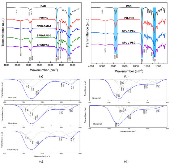 FTIR spectra of polyol/PU/SPUA/SPUU synthesized with (a) PAD and (b) PSC. Deconvolution in carbonyl region for PAD-based polyurethanes (c) and PSC-based polyurethanes (d).