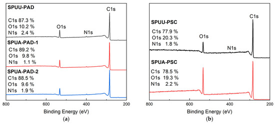 The SPUU-PAD sample had the highest amount of O1s bonds (10.2%), and the deconvolution of the C1s peak indicated that C–O and C=O bonds are present in greater amounts; both findings suggest the highest percentage of urethane groups due to the BO chain extender. In contrast, the amount of N1s increased from 1.1 to 1.9% for SPUA-PAD-1 and SPUA-PAD-2, respectively, and the percentage of N–(C=O)–O bonds rose from 18% to 55.9%, indicating an increase in the hard-segment percentage.