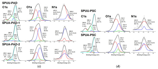 The XPS spectra of segmented polyurethanes made with PAD and PSC are shown in Figure 6. The peaks indicate the presence of three main elements—C1s, N1s, and O1s—with a binding energy range of 291–282, 405–396, and 537–528 eV, respectively. Figure 6a,b show the XPS survey spectra, while Figure 6c,d show the peak deconvolution of C1s, N1s, and O1s peaks of synthesized segmented polyurethanes and polyurethanes–ureas.