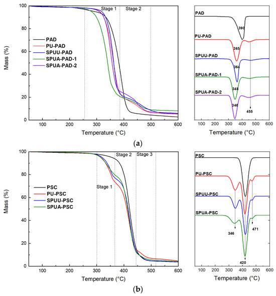 Thermogravimetric thermogram (TGA) curves and derivative thermogravimetric (DTGA) curves of polyols and polyurethanes are shown in Figure 7. From the TGA curves it is observed that PUs made from PAD and PSC started their degradation at lower temperatures compared to the polyol used in their synthesis. The initial decomposition (stage 1) for segmented polyurethanes is sometimes attributed to the degradation of the hard segment. However, for SPUPAD, this behavior was not observed, likely due to the mixing of hard and soft segments. This mixing resulted in a reduced thermal stability of polyurethane, which decreased further as the hard-segment content increased, as depicted for SPUPAD samples. Additionally, in the DTGA curve for PAD polyurethanes, degradation peaks shifted to lower temperatures (346–365 °C) compared to the polyol (390 °C). In contrast, PSC polyurethanes exhibited hard-segment decomposition in three stages, where the mass loss in stage 1 corresponded to approximately 13.7% (a value close to the 11.9% hard-segment percentage calculated by stoichiometry and described in Table 1) and a maximum DTGA peak at 346 °C. The second decomposition temperature (stage 2) indicated thermal degradation of the soft segments of polyurethanes with maximum degradation at 420 °C, similarly to the pristine PSC. Some authors indicated that when a DTGA peak is a superposition of pure components, it may suggest incompatibility [31], but in SPUPSC, it could be a result of a phase separation between soft and hard segments. The final stages of degradation showed peaks at 455 and 471 °C for SPUPAD (stage 2) and SPUPSC (stage 3), respectively, indicating the degradation of char residues.