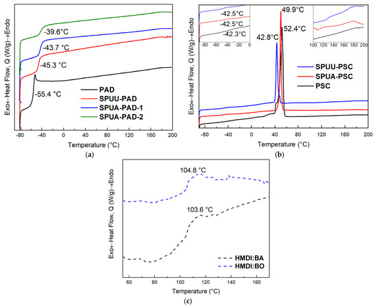 Differential scanning calorimetry characterization was performed to evaluate the microphase separation of SPU made with both polyols. Usually, in SPU with phase separation, up to four signals could be found, with two corresponding to the Tg and Tm of the polyol and the two others corresponding to the Tg and Tm of the hard segment. DSC thermograms of pristine PAD (Figure 8) show a glass transition temperature at −55.4 °C, whereas in SPUPAD, this event shifted to −45.3, −41.3, and −39.6 °C for SPUU-PAD, SPUA-PAD-1, and SPUA-PAD-2, respectively. Also, the heat flow variation at the Tg (∆Q) of PAD decreased with the incorporation of the hard segment and was further reduced as the hard-segment percentage increased. The shift in Tg was produced by a hard segment diluted in a soft-segment phase which slows down the mobility of the soft segment and results in an increase in glass transition temperature [32]. No hard-segment Tg was detected, thus indicating that it was dissolved in the soft-segment phase. In contrast, pristine PSC showed two endothermic events (see Figure 8b), a Tg at −42.3 °C and a Tm at 52.4 °C, while in their corresponding SPU, three characteristic endotherms were observed. The Tg of the polyol in the soft segment was identified to be −42.5 °C, with a Tm between 42.8 and 52.4 °C depending on composition, and finally, the Tg of the hard segment was close to 105 °C (see right inset in Figure 8b). The Tg values of the hard segment were confirmed by running DSC exclusively on them and are shown in Figure 8c. The three events in SPUPSC are an indication of phase separation, where SPUU-PSC shows a decreased Tm of pure PSC, suggesting a loss of crystallinity or that a fraction of the diluted hard segment reduces the size of the soft-segment crystals [33,34]. The absence of a melting peak for the hard segment (urethane or urea) could be due to the fact that HMDI is a mixture of isomers and does not crystallize, regardless of the chain extender (BO/BA) used.