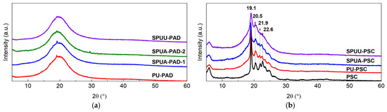 X-ray diffractograms of polyol/PU/SPUU/SPUA synthesized with (a) PAD and (b) PSC. Note: PAD diffractogram is not shown as it is a viscous liquid.