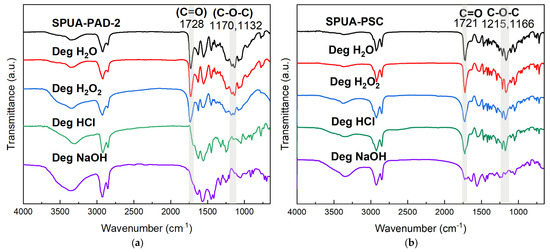 Degradation studies showed that oxidative, acidic, and alkaline media degrade both types of SPUA (PAD and PSC). SPUA-PAD-2 degraded by 5.5 ± 0.7%, 82.3 ± 8.0%, 70.8 ± 0.70%, and 50.0 ± 0.11% in , , HCl, and NaOH media, respectively, whereas SPUA-PSC showed a degradation of 2.2 ± 0.3%, 20.3 ± 1.2%, 45.5 ± 2.3%, and 67.9 ± 3.3% in , , HCl, and NaOH media, respectively. However, SPUA-PAD-2 samples are more prone to degradation as evidenced by the higher loss mass percentage observed and its FTIR spectra (Figure 10a) that showed the disappearance of bands related to C=O and C-O-C groups under hydrolytic degradations (HCl and NaOH), so it can be inferred that a large part of the flexible segment is degraded. It is interesting to note that the oxidative media () caused more degradation on PAD-based polyurethane, but the corresponding spectra were similar to the non-degraded polyurethane, so it is likely that degradation occurred by surface erosion rather than in bulk or oligomer formation (chain scission) [42]. On the other hand, the IR spectra of the SPUA-PSC polymer (see Figure 10b) only showed C=O and C-O-C band disappearance in the alkaline medium (NaOH). It is interesting to observe that for both SPUAs, the OH peak around 3500 cm⁻¹ increased in the alkaline medium, suggesting that PAD and PSC were hydrolyzed, forming an OH group.