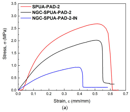 The PU-PAD sample did not form a film, while PU-PSC was a fragile and brittle polymer. Therefore, these PU models were discarded for mechanical studies and for use in the manufacture of nerve guide conduits. The mechanical properties of the films of the synthesized SPUU/SPUA are reported in Table 2, and stress–deformation curves are shown in Figure 11.
