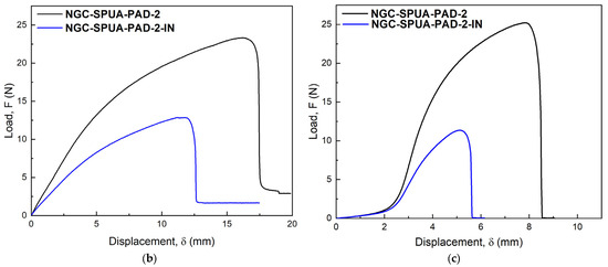 The representative force–displacement curve for the radial tensile test of the NGC-SPUA-PAD-2 rings is shown in Figure 12c. The maximum radial force calculated for the dry tubes was 25.1 ± 1.24 N and the circumferential tensile strength was 1.32 ± 0.06 N/mm, while for the conditioned tubes, these values were 11.24 ± 2.03 N and 0.56 ± 0.11 N/mm, respectively. As in the case of the longitudinal tension tests, the radial tension mechanical properties also decreased by more than half.