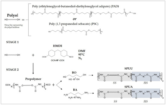 Synthesis of SPUU and SPUA based on PAD or PSC polyols.