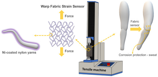 Illustration of a wearable application using DMSO-modified nickel-coated polymer fibres integrated into a strain-sensing knitted fabric.