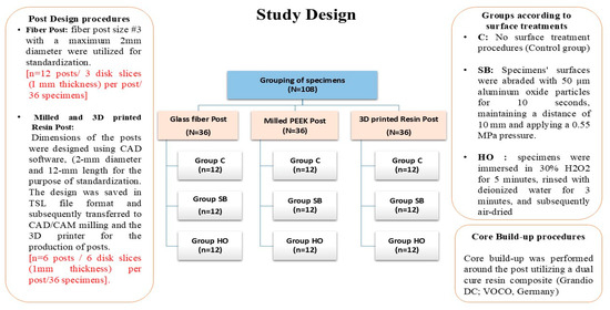 Three resin posts were utilized in this study: ready-made glass-reinforced fiber post (3M ESPE, Seefeld, Germany), Milled PEEK POST (Bredent, Senden, Germany), and 3D-printed resin post (CROWNTEC, Saremco Dental AG, Rebstein, Switzerland). Each type of post was classified into three groups according to surface treatments. The core build-up was performed around the post utilizing a dual-cure resin composite (Grandio DC; VOCO, Cuxhaven, Germany). A total of 12 specimens per group was required to attain a power of 0.95 at a 5% significance level. The materials used in this study and their manufacturers are presented in Table 1. The study design is presented in Figure 1.