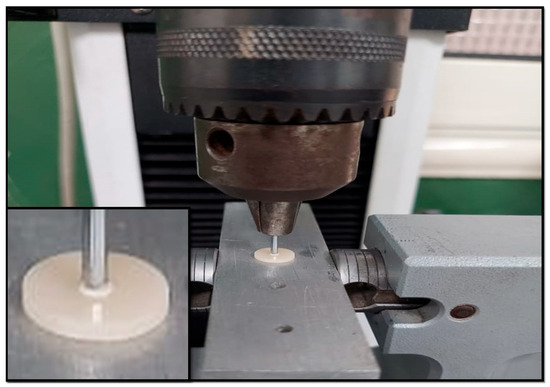 The push-out bond strength was assessed using a universal testing machine (Instron 5965, Canton, MA, USA). Specimens were secured in the lower jaw of the machine. A cylindrical plunger with a diameter of 1 mm was positioned centrally on the disk specimen. The specimen was subjected to compressive loading at a crosshead speed of 0.5 mm/min. (Figure 2). Bond strength is calculated in MPa by dividing the failure load by the bonding area (N/mm2). A = 2r × π × h provides the bonding area for each post, r is the post radius, π is approximately 3.14, and h is the thickness of the post slice [23]. Using a stereomicroscope at 40× magnification. Failure modes were classified as adhesive failure between the post and core materials, cohesive failure within the post or core material, and mixed failure.