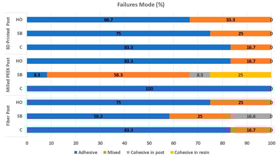 Mode of failure data are presented in Figure 3. Adhesive failure was the predominant failure type, with an occurrence rate of 70.35%. Mixed failure was noted in 24.07% of the cases, with a significant prevalence in the PEEK within the SB group (58.3%). Cohesive failure was noted in 5.54% of instances, with a significant prevalence in the SB group, occurring at rates of 16.6% in ready-made fiber posts and 33.3% in PEEK posts. With a closer look at the data, in group C, adhesive failure was the predominant type of failure, occurring at a rate of 88.86%, while mixed failure accounted for 11.14%. There were no instances of cohesive failure. In the SB group, adhesive failure was the predominant type of failure, occurring in 49.69% of cases. Conversely, the air particle abrasion in the PK group displayed mixed and cohesive failures as the main types, occurring at rates of 58.3% and 33.3%, respectively. In the HO group, adhesive failure was observed in 75% of cases, while mixed failure occurred in 25%. No instances of cohesive failure were observed.