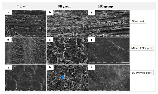 SEM micrographs (500×) (a–c) glass fiber post; (d–f) milled PEEK post; (g–i) 3D-printed resin post. Blue arrow indicates dislodgment of fillers.