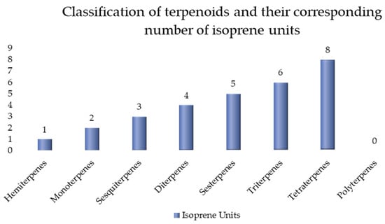 Most terpenes have isoprene (2-methyl-1,4-butadiene) as a common carbon skeleton building block. Wallach discovered this structural feature as early as 1887 and pointed out that most terpenes are formed by the condensation of isoprene units in a “head-to-tail” manner, a rule known as the “isoprene rule”. Based on this rule, terpenes can be classified according to the number of isoprene units they contain [38], as shown in Figure 3.